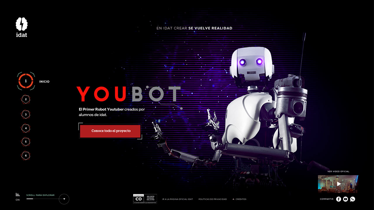 Youbot es un proyecto construido por las escuelas del Instituto Idat, su misión es descifrar el mundo de los millenials y zentenials, compartiendo entretenidos videos relacionados